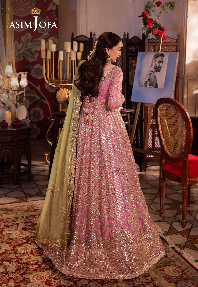 Transformed into a living petal, this pink ensemble is a fairytale garden in bloom. The embroidered Peshwas, a delicate flower unfurling, is adorned with a cascade of light gold dewdrop-like sequins, coupled with 5mm and 9mm gold sequins amidst the intricate amalgam of gold zari and beige threads, weaving a glittering path guiding the gaze gently toward a blooming pink rose. The green embroidered dupatta, a verdant oasis, concludes this dreamlike story with a flourish.