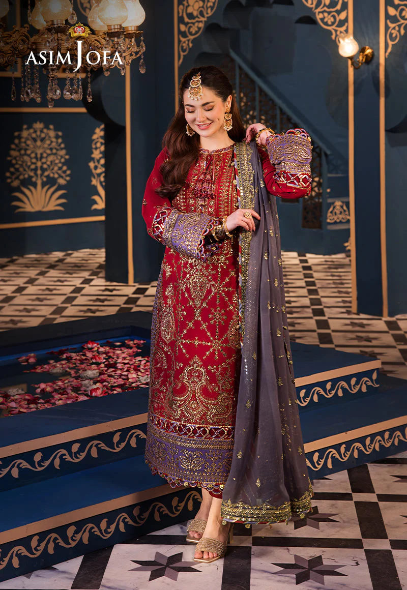 Adorn yourself in the richness of royal elegance with this exquisite ensemble featuring a vibrant red outfit adorned with the intricate tapestry of deep gold zari work embellished with sparkling 5mm and 3mm sequins. The ensemble weaves a tale of grandeur with embroidered front panels reminiscent of a royal tapestry. The embroidered back echoes the splendor of regal courts while the meticulously crafted sleeves exude sophistication and grace. Contrast purple borders for daaman and sleeves add depth and richness to the ensemble evoking the essence of royal opulence. Complete your ensemble with the embroidered border for chaak and the majestic purple dupatta. Step into the regal tapestry of royal elegance with this majestic ensemble, perfect for grand celebrations and royal gatherings.