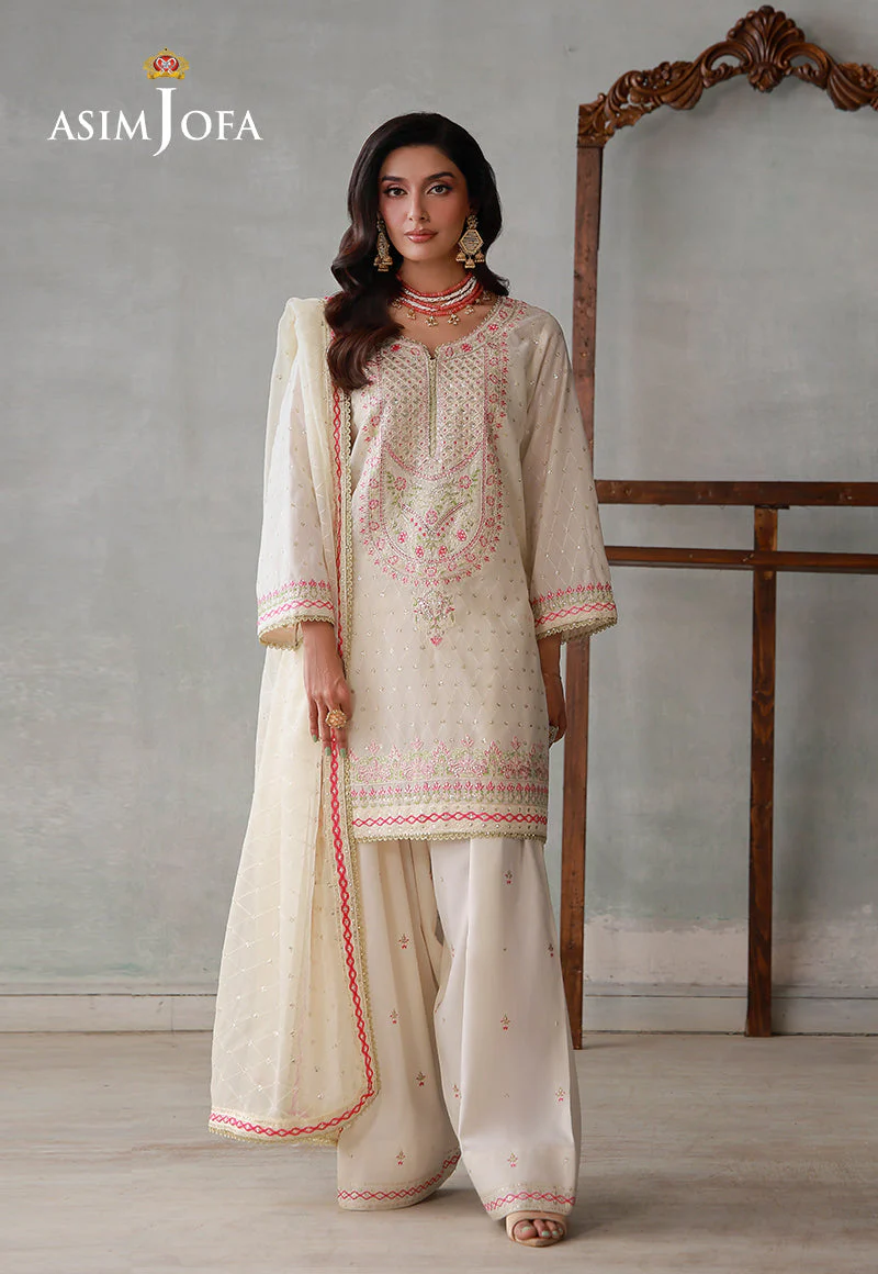 Bathed in understated elegance, this off-white ensemble unfolds with a refined, luminous allure. The shirt is exquisitely adorned with pastel-toned embroidery, delicately set against the pristine canvas to create a soft yet captivating contrast. Perfectly complemented by impeccably tailored trousers detailed with graceful embroidery, the look is completed with a whisper-light embroidered dupatta. Together, the ensemble embodies timeless sophistication, making it an irresistible choice for festive occasions.
