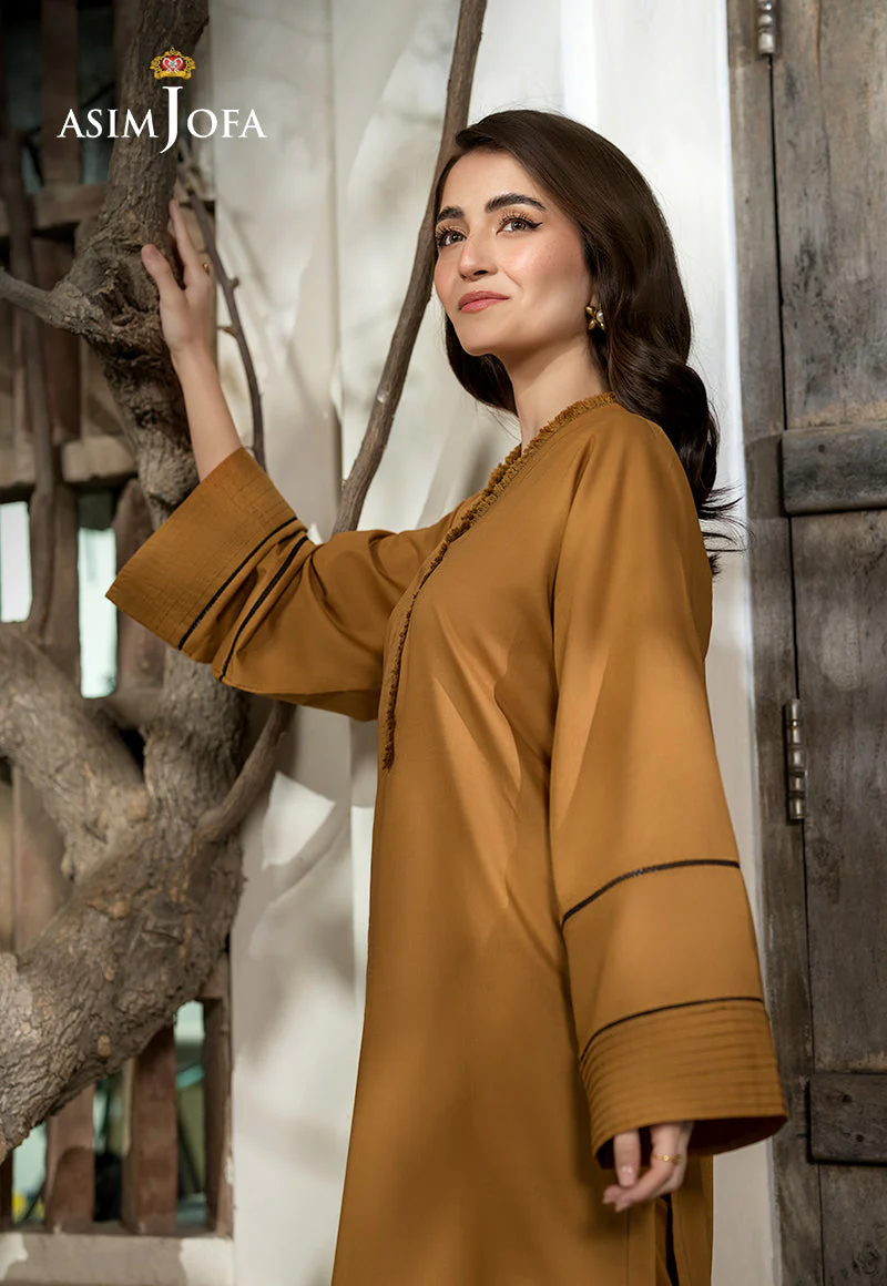 Radiate luxury with this dark gold ensemble. The solid shirt is subtly accented with fine stitching details, enhancing its rich hue with a touch of sophistication. Paired with plain trousers, this outfit effortlessly combines classic elegance with modern simplicity.