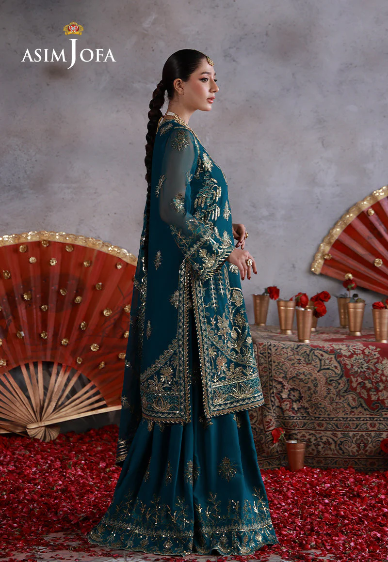 A rich, heritage-inspired vision that balances the weight of tradition with a sharp, modern clarity. Bathed in a deep teal hue, this ensemble is adorned with gold zari and shimmering sequins, illuminated by accents of aqua green threadwork. The heavily embroidered trousers and dupatta enhance the regal appeal, creating a cohesive look that feels both timeless and contemporary. Designed for the woman who carries elegance with quiet confidence, this ensemble makes a powerful statement of refined luxury.